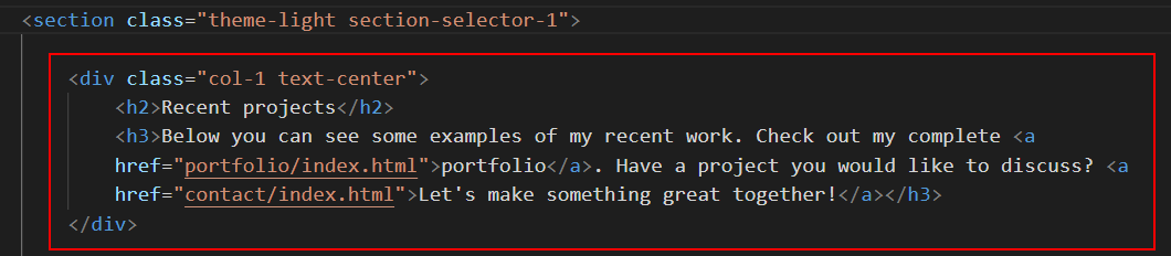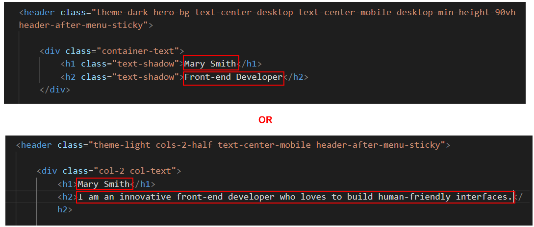 - Using the examples from text.html, edit the pasted header hero block as shown below.