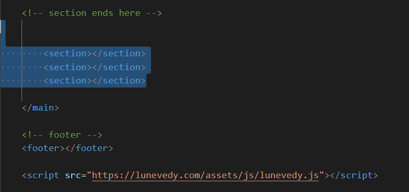 - Select and delete the three empty <section> tag pairs from the index.html file. You will not be using these.