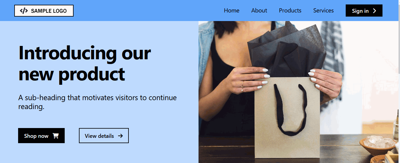 A second common choice is a two-column layout with text in one column and an image in the other. In Lunevedy, you can create this layout type with the Hero Block 2 option. See below.